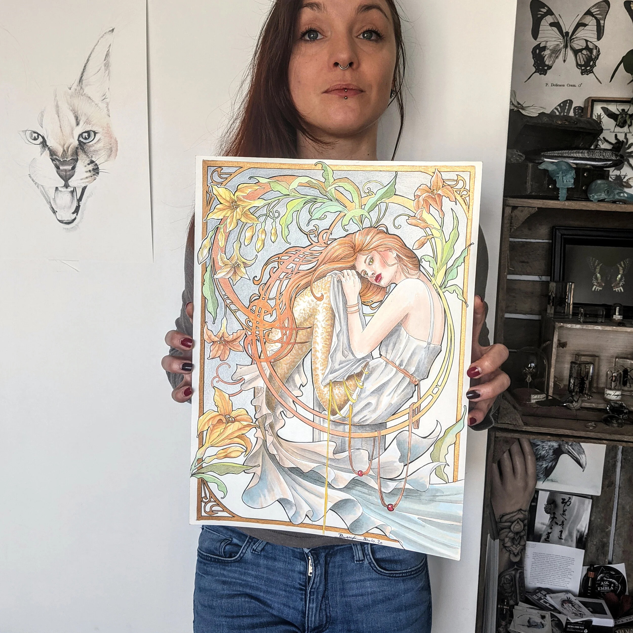 Stylo, crayon de couleur, aquarelle, promarker et acrylique dorée